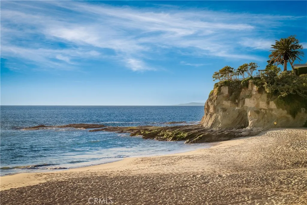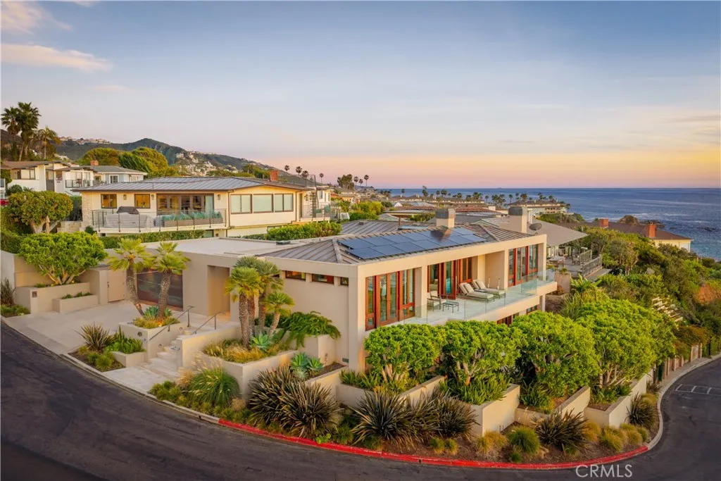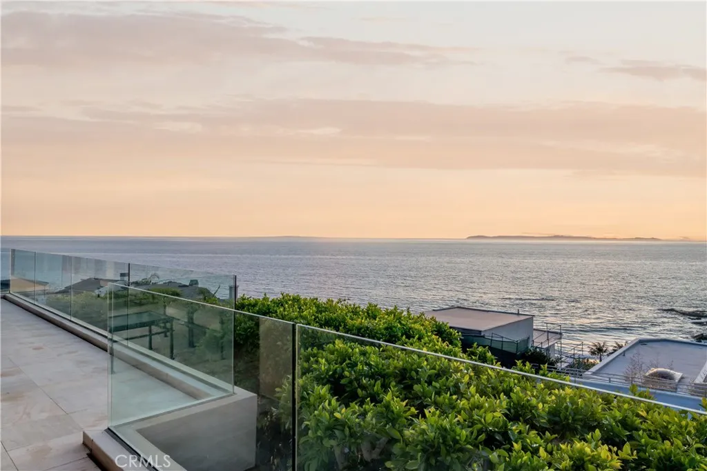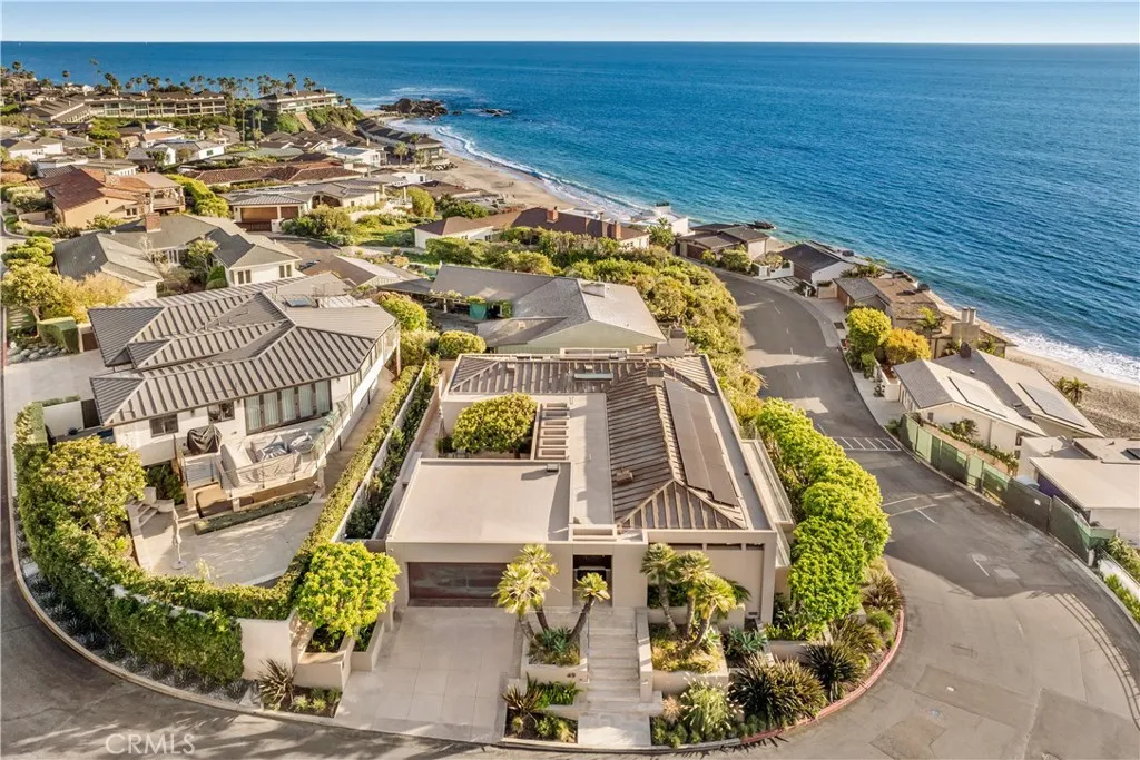Located in the exclusive gated enclave of Lagunita, this striking soft-modern estate offers a blend of coastal sophistication and serene privacy. Positioned on a commanding ~10,500 square foot corner lot just one row back from the sand, the residence spans approximately 3,726 square feet of light-filled space designed to frame panoramic views of the Pacific Ocean, whitewater, and Catalina Island. The heart of the home is a voluminous great room with high ceilings and clean architectural lines, seamlessly transitioning to the ocean-facing upper deck via Italian doors. The adjoining kitchen offers breathtaking vistas and premium appliances. The thoughtful floor plan prioritizes ease of living with the primary suite situated on the main level, featuring floor-to-ceiling glass and a balcony to capture the morning sea breeze. A versatile den with access to the outside serves as an ideal home office or offers an opportunity for a fifth bedroom conversion. French limestone transitions from the main section to a private rear patio, where a tranquil water feature creates a peaceful sanctuary for alfresco dining and relaxation. A dedicated lower guest level offers three additional well-appointed bedrooms. Residing in Lagunita provides the quintessential Southern California lifestyle, including beach access to one of South Laguna's most pristine stretches of sand. With its significant 10,500-square-foot lot and proximity to world-class dining and galleries, this property represents a premier opportunity for the discerning buyer seeking the quintessential Laguna Beach experience.