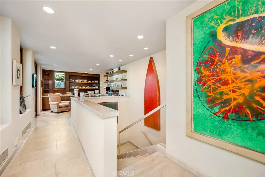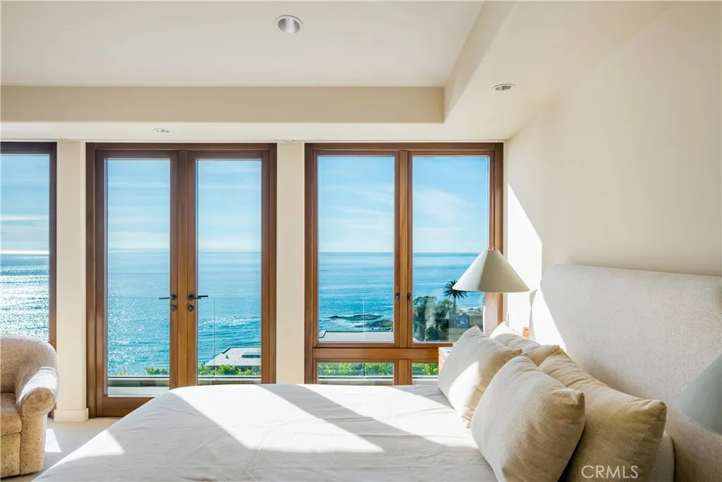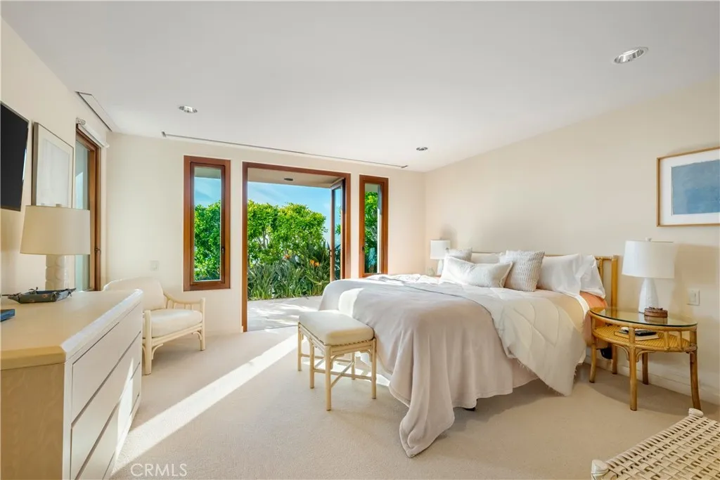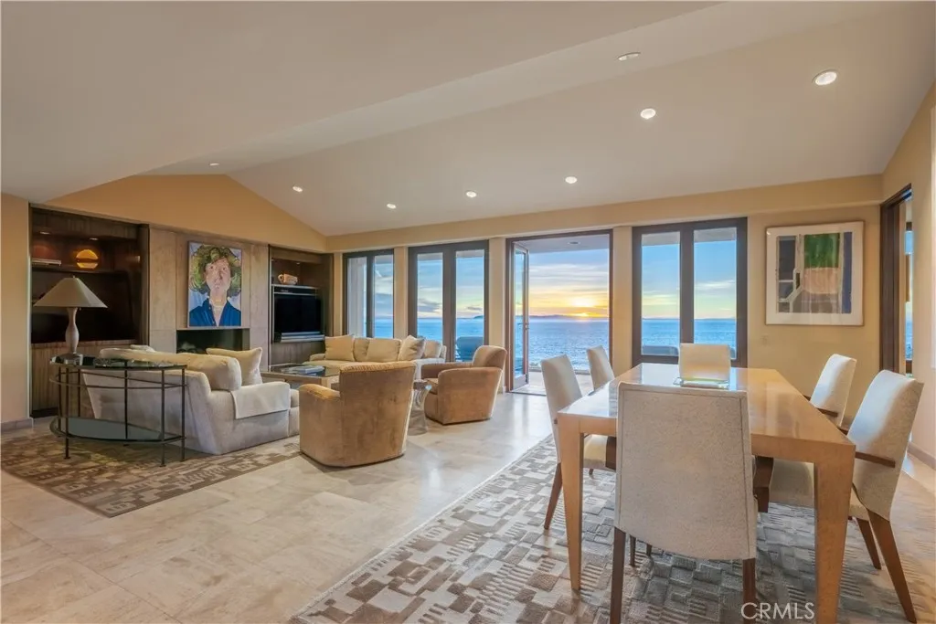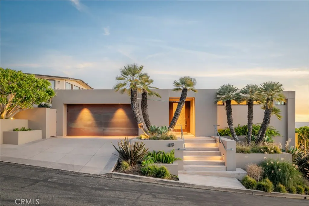 Located in the exclusive gated enclave of Lagunita, this striking soft-modern estate offers a blend of coastal sophistication and serene privacy. Positioned on a commanding ~10,500 square foot corner lot just one row back from the sand, the residence spans approximately 3,726 square feet of light-filled space designed to frame panoramic views of the Pacific Ocean, whitewater, and Catalina Island. The heart of the home is a voluminous great room with high ceilings and clean architectural lines, seamlessly transitioning to the ocean-facing upper deck via Italian doors. The adjoining kitchen offers breathtaking vistas and premium appliances. The thoughtful floor plan prioritizes ease of living with the primary suite situated on the main level, featuring floor-to-ceiling glass and a balcony to capture the morning sea breeze. A versatile den with access to the outside serves as an ideal home office or offers an opportunity for a fifth bedroom conversion. French limestone transitions from the main section to a private rear patio, where a tranquil water feature creates a peaceful sanctuary for alfresco dining and relaxation. A dedicated lower guest level offers three additional well-appointed bedrooms. Residing in Lagunita provides the quintessential Southern California lifestyle, including beach access to one of South Laguna's most pristine stretches of sand. With its significant 10,500-square-foot lot and proximity to world-class dining and galleries, this property represents a premier opportunity for the discerning buyer seeking the quintessential Laguna Beach experience.
