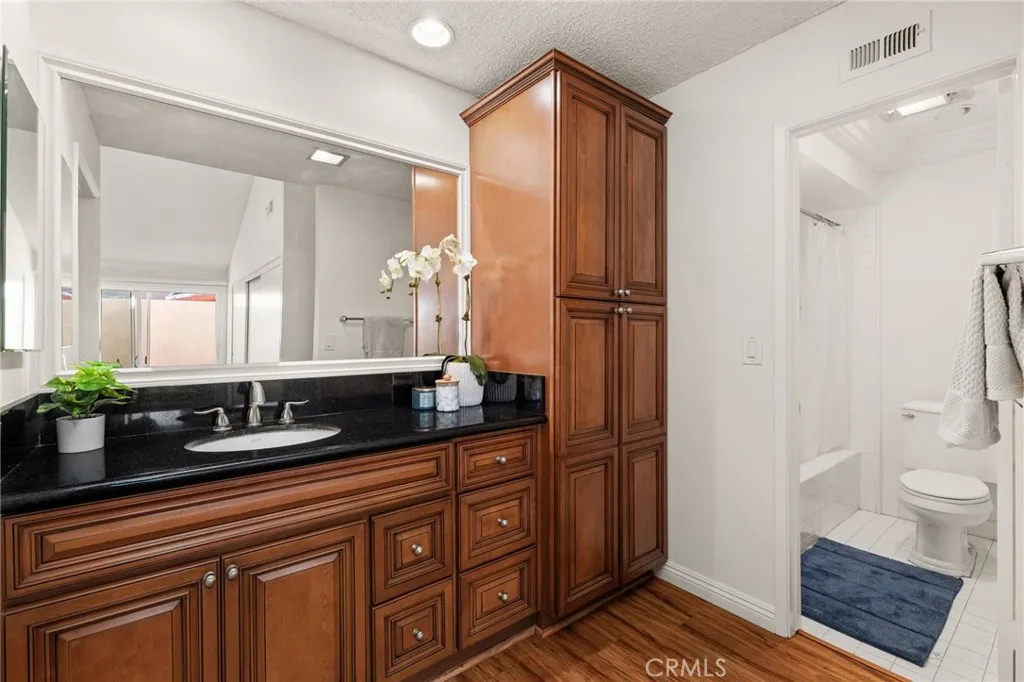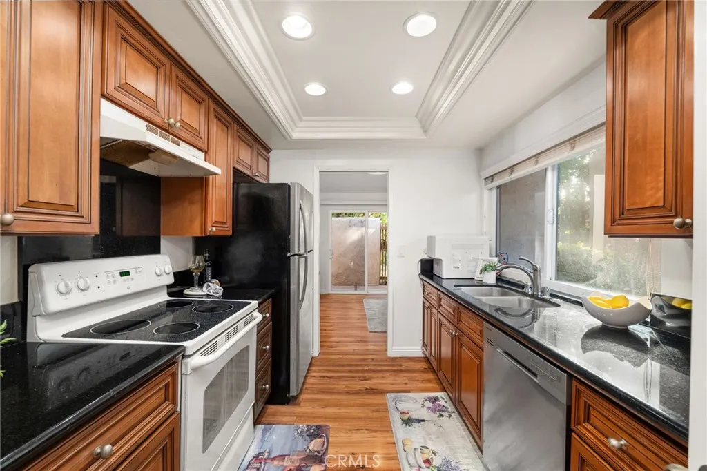 This lovely single level townhouse is a desirable end unit in the sought-after Buena Tierra gated community. Featuring spanish roof tiles, a large open floor plan, vaulted ceilings, laminate flooring, and a spacious primary suite, it is truly move-in ready. The galley kitchen has been recently remodeled with recessed lighting, and the formal dining room easily doubles as a home office. The home has been freshly painted throughout and has dual pane windows. Laundry setup is inside, and the outside offers 2 patios that are perfect for hosting. It has a two car garage and 2 car driveway, and the community offers a community pool, spa, and tons of parking. It's close to Los Coyotes Country Club and Ralph B. Clark Park and there are multiple hiking trails nearby. The home's assigned schools include the award winning Sunny Hills High School, Beatty Middle School, and Emery Elementary.